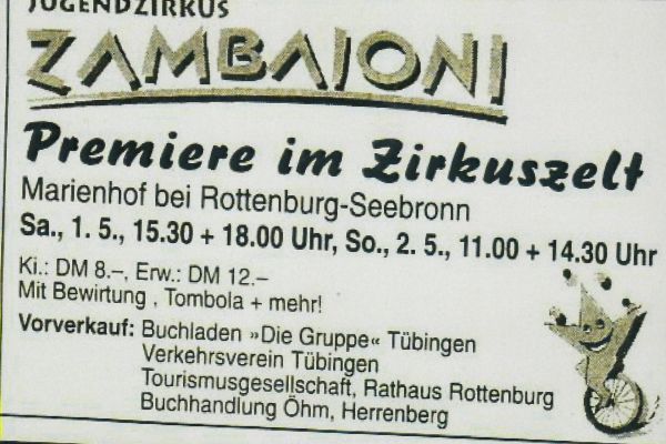Für Geschwisterkinder gibt es ein neues Zirkuskursangebot: die "Zirkusflöhe" (später "Zirkus-Club"). Die Gruppe für Kleinauftritte erhält den Namen "Flotte Truppe". Thomas di Paolo entwirft den charakteristischen Zambaioni-Schriftzug, und der Zambaioni bekommt sein erstes Zirkusbüro (im alten Hühnerstall) sowie ein Lager auf dem Heuberger Hof. Erstmals treten jugendliche Zambaioni-Artist*innen auf dem Tübinger Weihnachtsmarkt auf – den Stand mit den leckeren Waffeln, Punsch und Glühwein gibt es aber noch nicht.