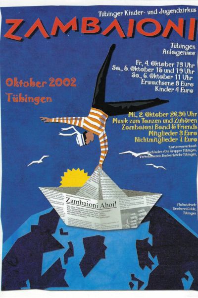 Vom 4. bis 6. Oktober 2002 legt die "ZAMBAIONI" am Anlagensee in Tübingen an, um von ihren Abenteuern zu erzählen! Versäumen Sie nicht, sich in entlegene Winkel dieser Welt, in Meerestiefen und Traumwelten entführen zu lassen! Musikalisch wird die Kreuzfahrt vom seetüchtigen Zambaioni-Bord-Orchester begleitet.